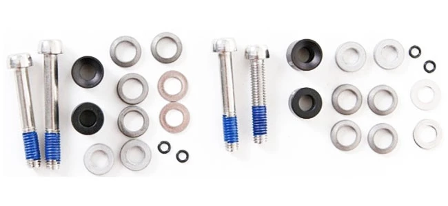 Im Lieferumfang Post Mount Spacer 17,5 mm, 12,5 mm und 7,5 mm, fuer 160 mm hinten, 180 mm vorne, Schrauben, rostfrei, 43 mm, 38 mm, 37 mm und 32 mm, mit Unterlegscheiben und Halbrundscheiben