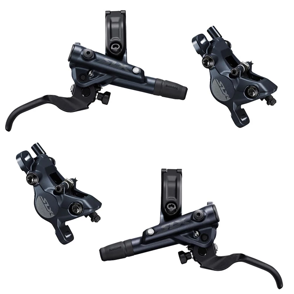 Die SLX Bremssaettel haben immer den Post Mount Bremssattel und passendem Adapter zu der Scheibengroesse und Gabel. Die Bremsen der Deore SLX sind sowohl als XC-spezifische Zwei-Kolben-Bremsen wie auch als Vier-Kolben-Bremsen fuer Trail/Enduro verfuegbar. Die Zwei-Kolben-Version weist dabei ein aehnliches Design auf wie die Vorgaengerversion der M7000 Linie, weshalb die bisherigen Bremsbelaege G02A, G03A, J02A, J03A, Resin, bzw. G04S und J04C, Metall, hier auch kuenftig zum Einsatz kommen. Die Vier-Kolben-Variante ist dagegen eine komplette Neuentwicklung, die sich im Design an ihre grosse Schwester aus der XTR M9100 und XT M8100 Serie anlehnt, mit der sie auch die Bremsbelaege N03A, Resin mit Kuehlrippen, und N04C, Metall mit Kuehlrippen, teilt. Zusaetzlich ist sie mit den Belaegen D03S, Resin ohne Kuehlrippen, und D02S, Metall ohne Kuehlrippen, kompatibel.