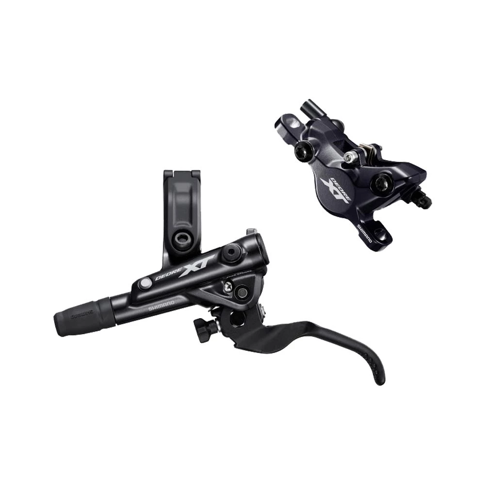 Die XT Bremssaettel haben immer den Post Mount Bremssattel und passendem Adapter zu der Scheibengroesse und Gabel. Die Bremsen der Deore XT sind sowohl als XC-spezifische Zwei-Kolben-Bremsen wie auch als Vier-Kolben-Bremsen fuer Trail/Enduro verfuegbar. Die Zwei-Kolben-Version weist dabei ein aehnliches Design auf wie die Vorgaengerversion der M8000 Linie, weshalb die bisherigen Bremsbelaege G02A, G03A, J02A, J03A, Resin, bzw. G04S und J04C, Metall, hier auch kuenftig zum Einsatz kommen. Die Vier-Kolben-Variante ist dagegen eine komplette Neuentwicklung, die sich im Design an ihre grosse Schwester aus der XTR M9100 Serie anlehnt, mit der sie auch die Bremsbelaege N03A, Resin mit Kuehlrippen, und N04C, Metall mit Kuehlrippen, teilt. Zusaetzlich ist sie mit den Belaegen D03S, Resin ohne Kuehlrippen, und D02S, Metall ohne Kuehlrippen, kompatibel.