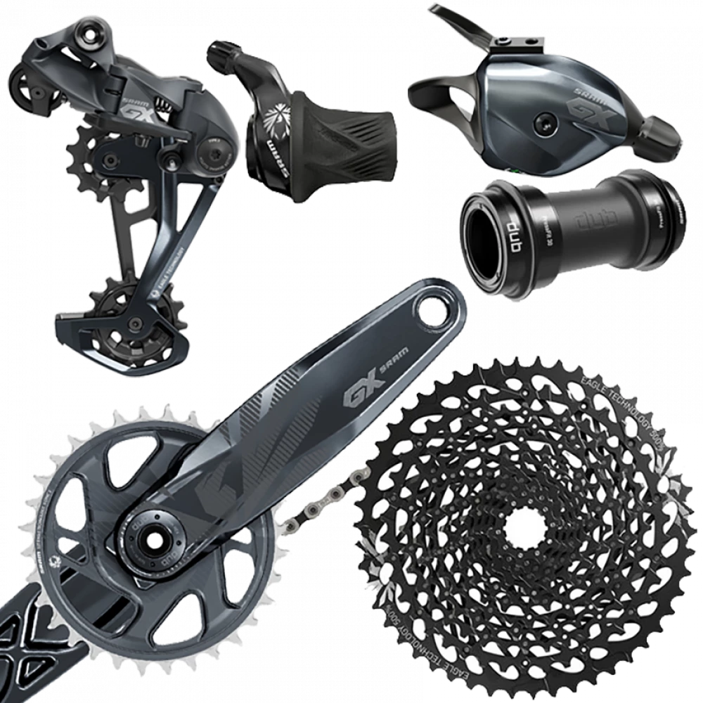 Die Sram GX Eagle Komponenten, die preiswerte und robuste Ausfuehrung der 12 fach Eagle Komponenten von Sram mit einem Kettenblatt und der 12 fach Kassette mit 10-52 Zaehnen.